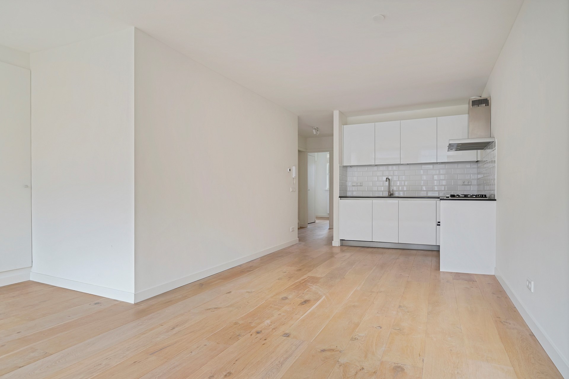 At the front of the apartment is the spacious living room with a cozy French balcony. Furthermore, a lovely sitting area, enough space for a large dining table and an adjacent kitchen.