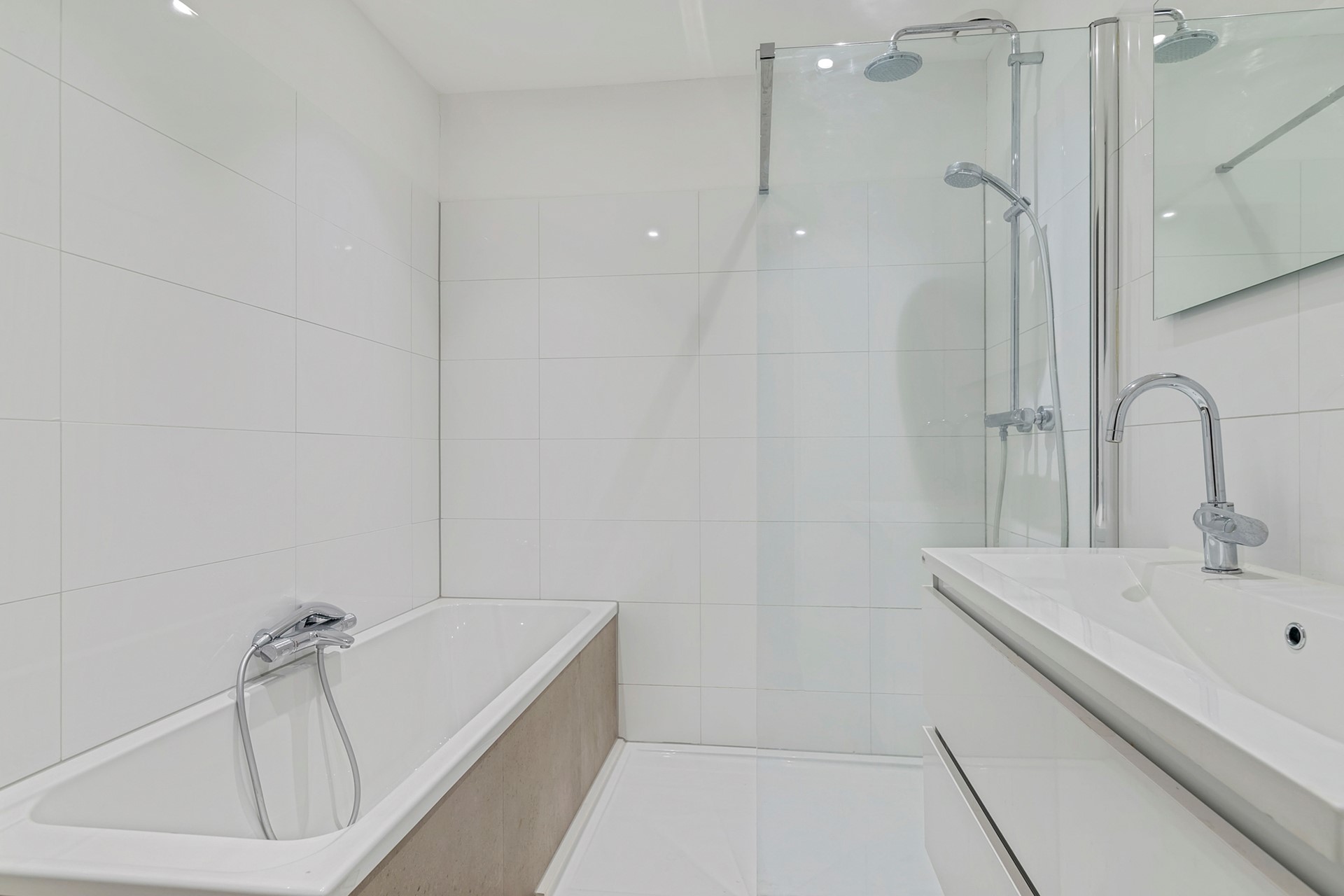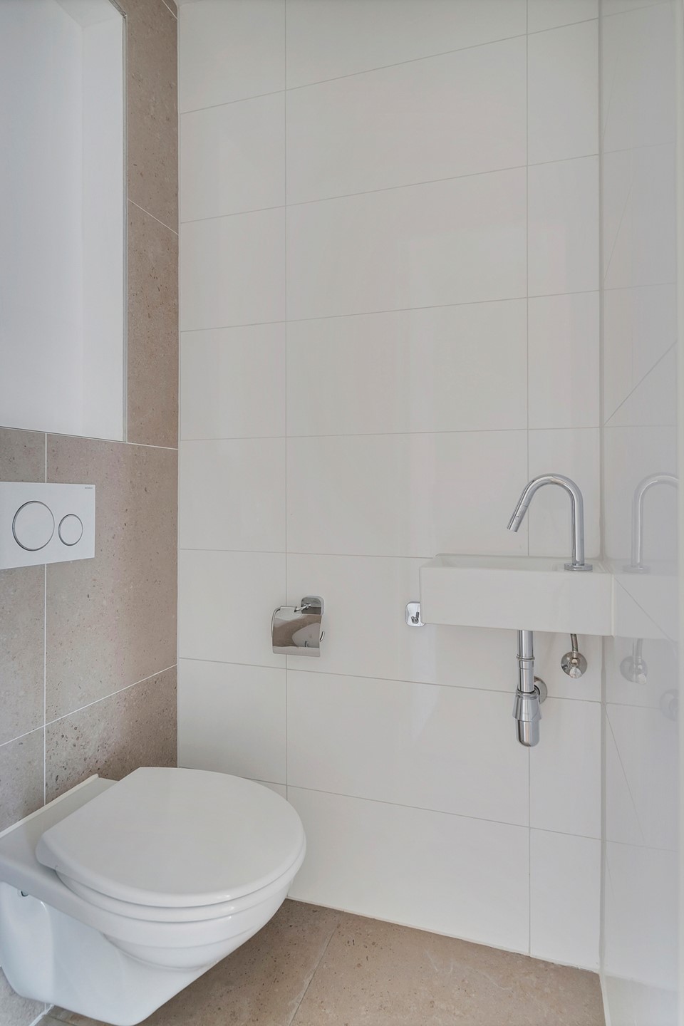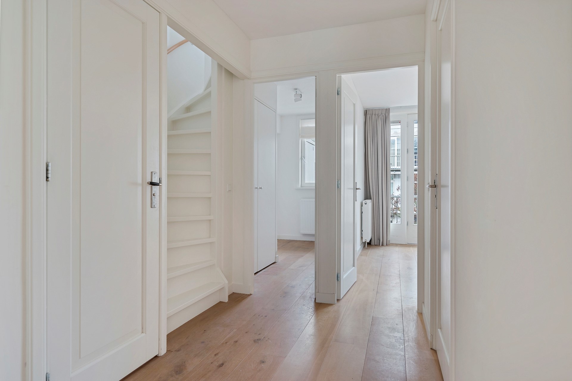Located at the rear you will find two bedrooms, the most spacious bedroom offers enough space for a large double bed and plenty of closet space. Furthermore, the bedroom provides access to the wide rear balcony where you can enjoy. Also located here is a separate smaller (sleeping) room. The first bathroom is centrally located on this floor and equipped with a bathtub, double sink and walk-in shower. Separate laundry room and toilet with hand basin.