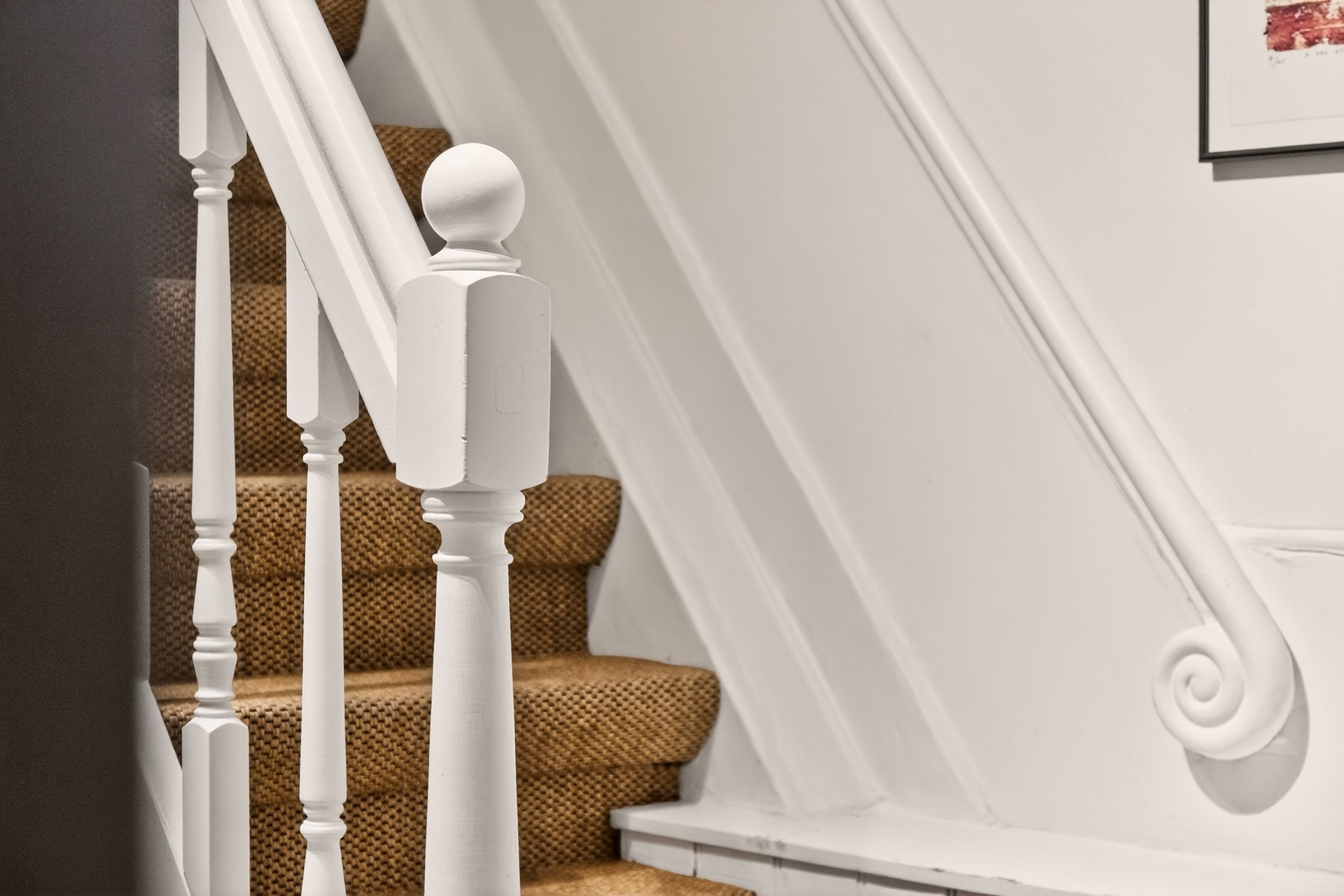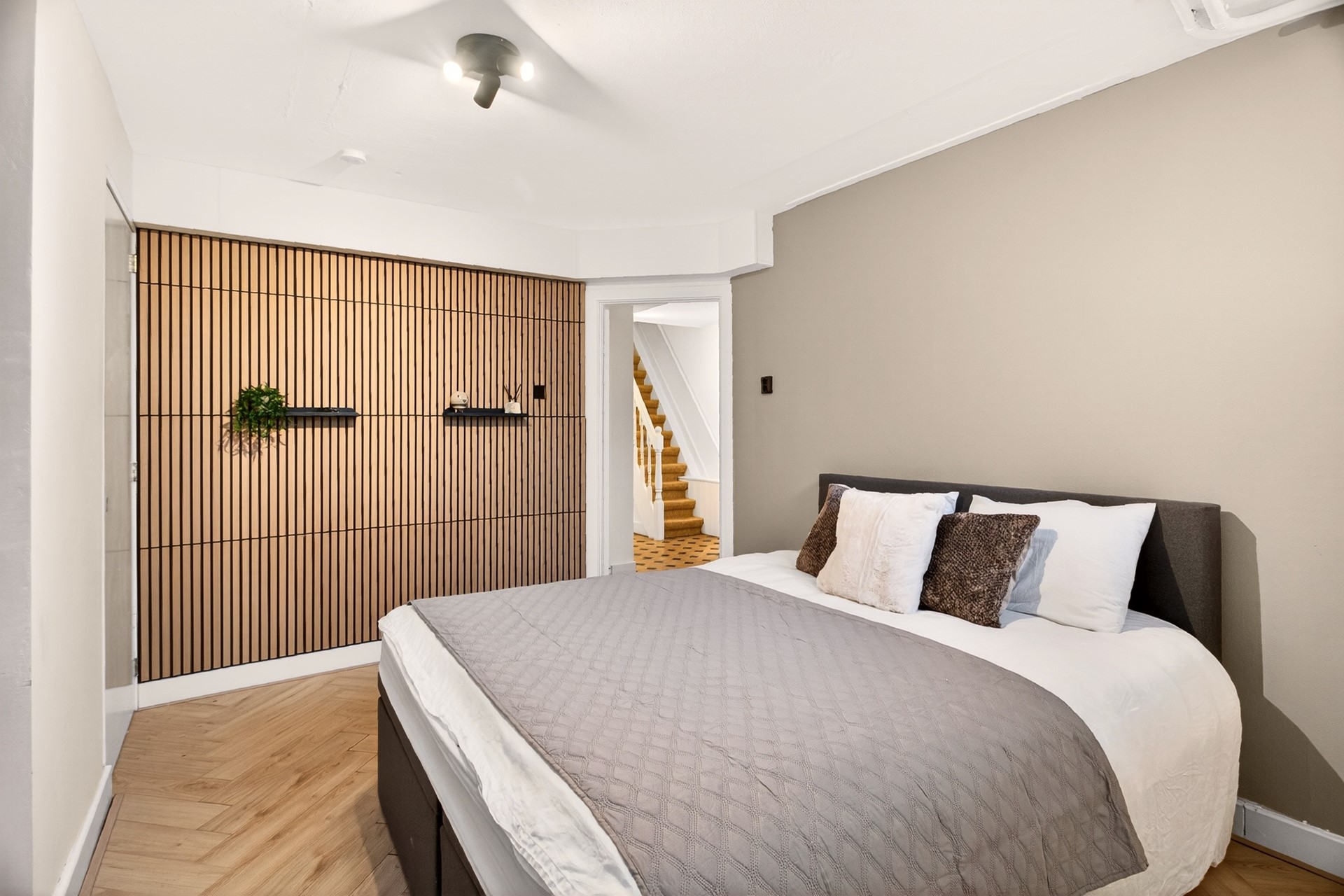 An internal staircase leads to the sleeping level, where two spacious bedrooms, a well-appointed second bathroom, and a generous walk-in wardrobe are located.