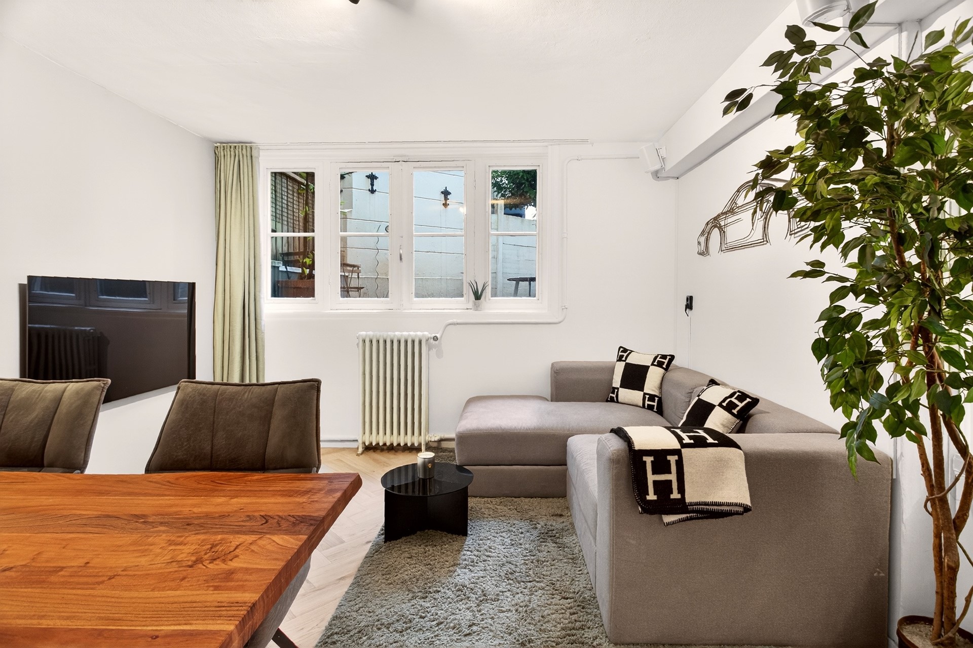 The spacious living room is located at the front of the apartment and is characterised by large windows that provide abundant natural light and stunning, unobstructed views over the Singelgracht canal. The living area easily accommodates both a comfortable seating area and a generous dining setup, ideal for entertaining guests.
