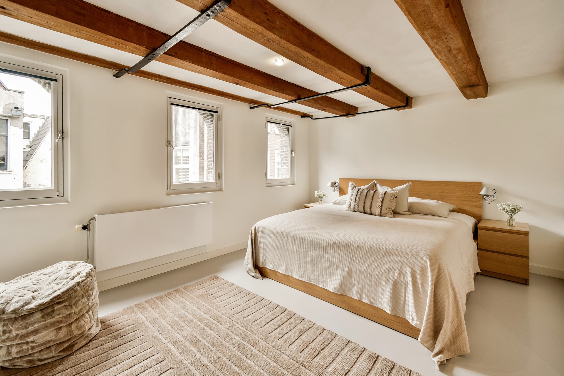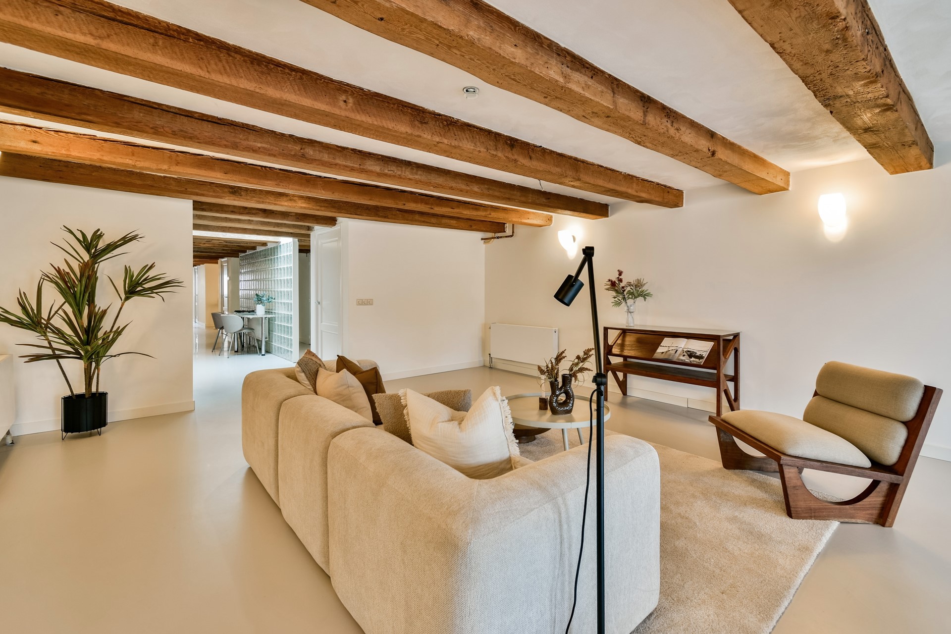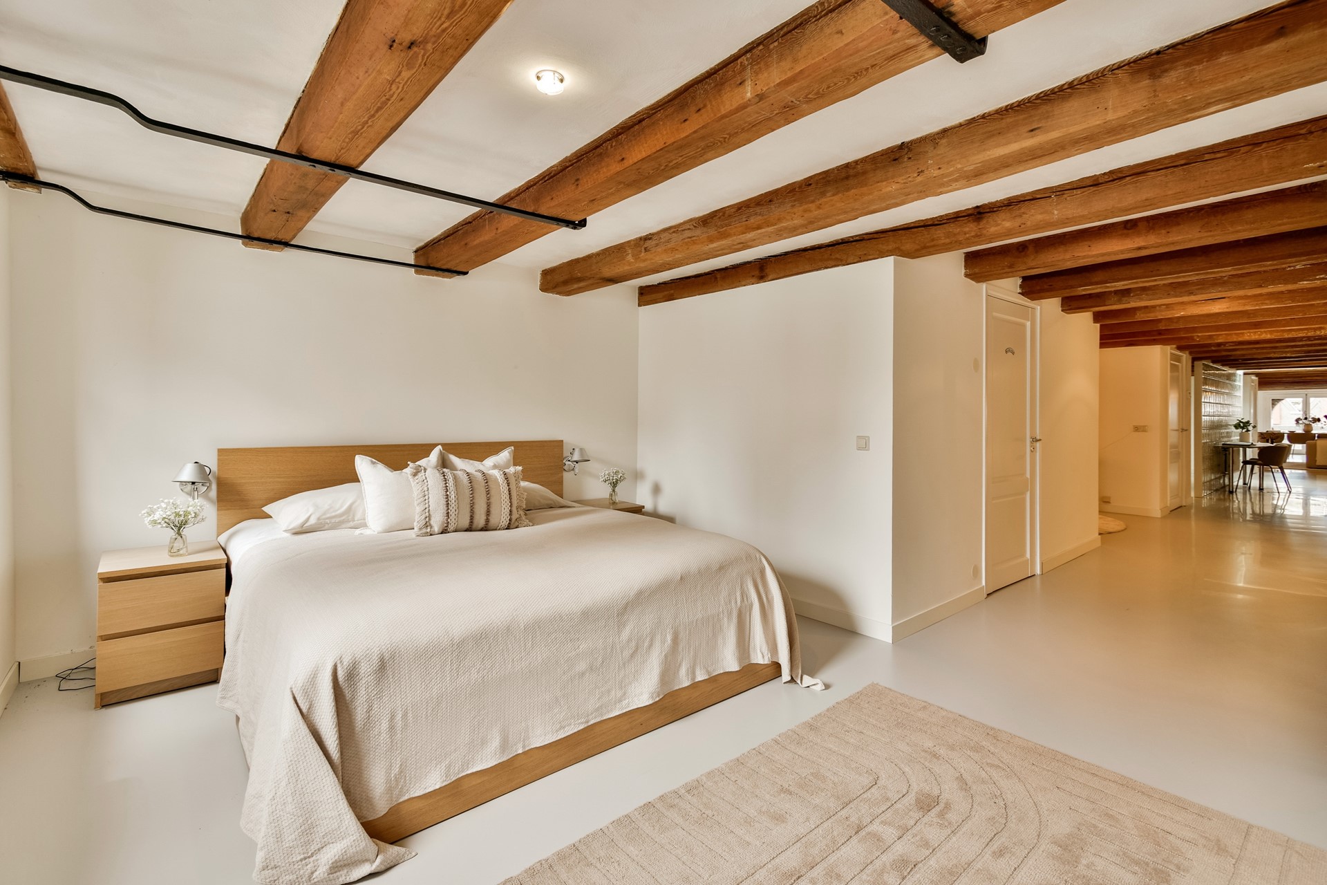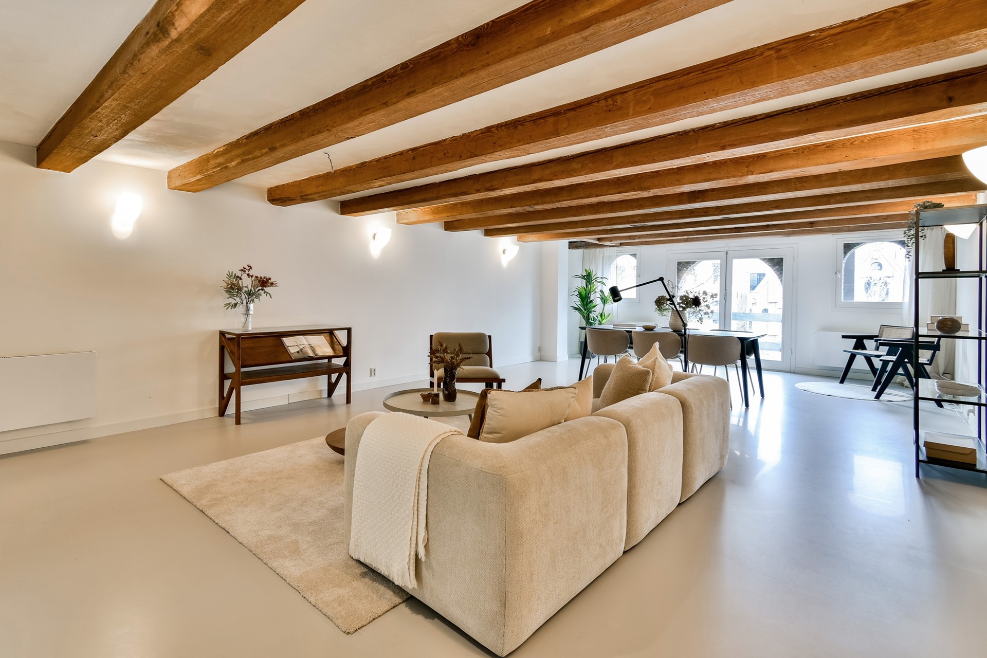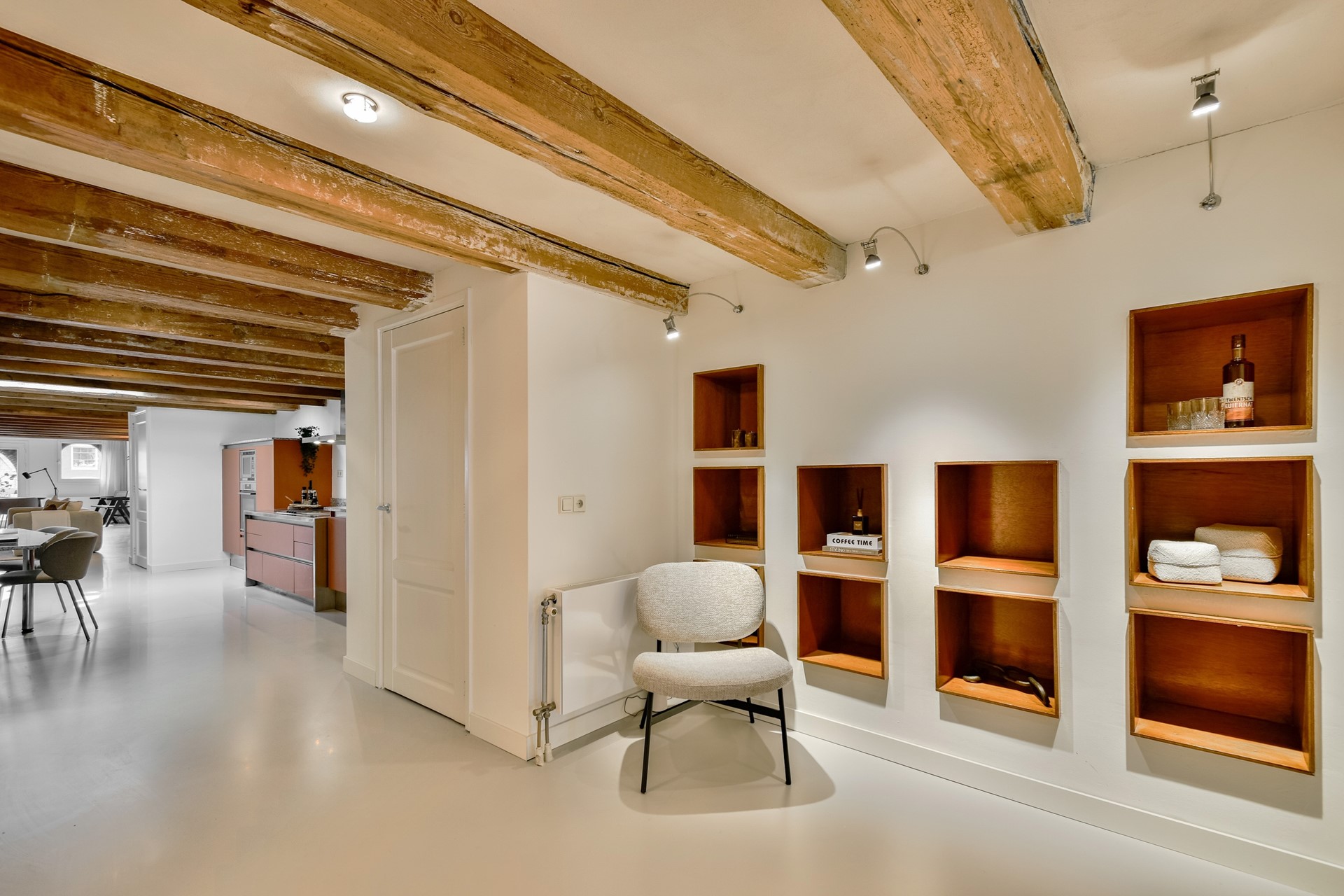 The apartment is located on the second floor and is characterized by its impressive width, beautiful natural light, and authentic details, such as the sturdy wooden beams. The spacious living room at the front offers a stunning view of the canal and creates a unique living space with a special sense of space and character.