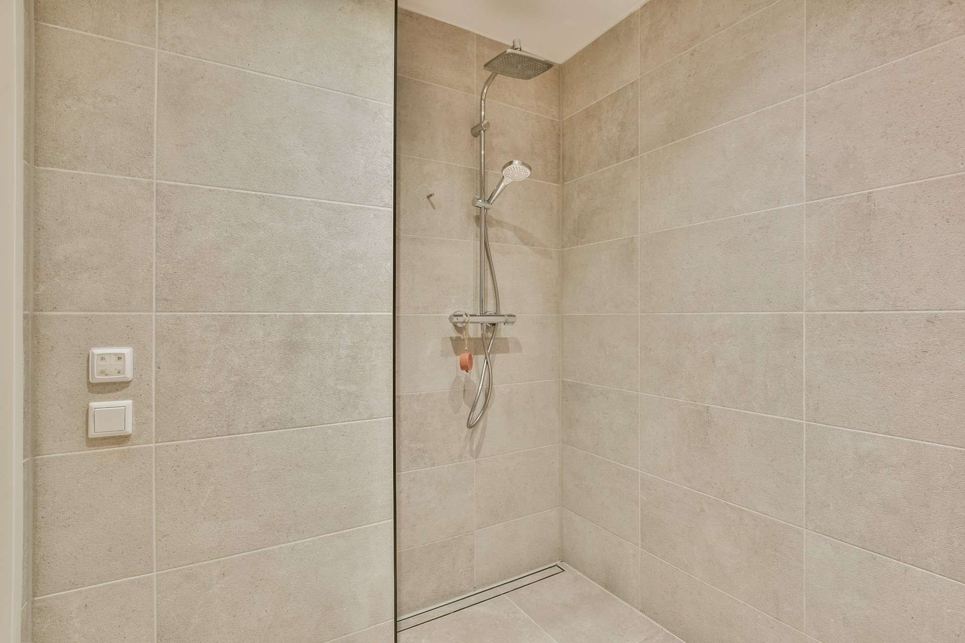 The bathroom is centrally located in the property and features a walk-in shower and washbasin vanity unit. In addition, the apartment has a separate toilet and a practical internal storage room housing, among other things, the central heating installation (2024) and the washing machine setup.