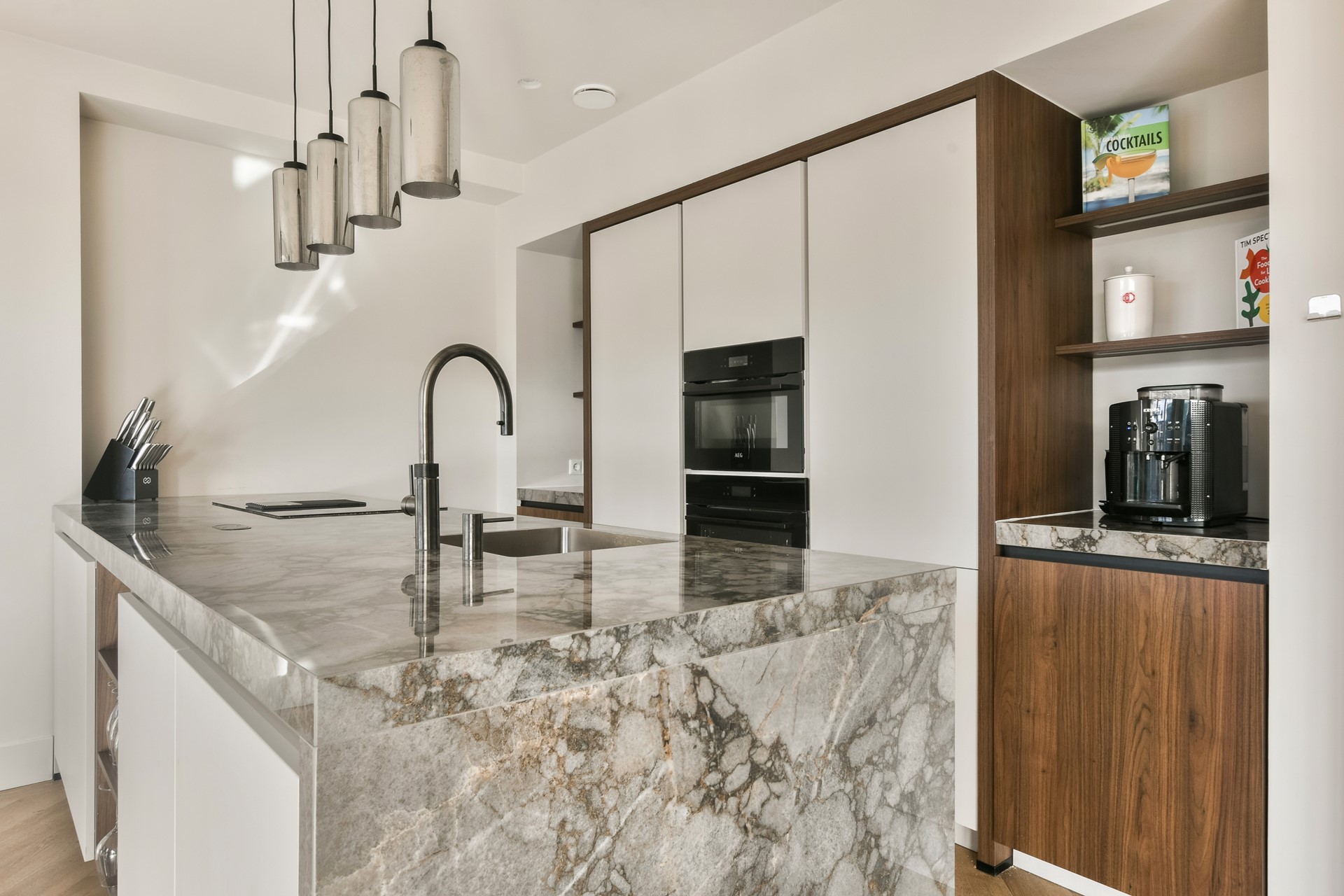 The open kitchen is generously sized and located at the front, directly adjacent to the seating area. The kitchen is finished with high-quality materials and equipped with various built-in appliances (including a dishwasher, induction hob with integrated extractor, oven, combination microwave, Quooker 5-in-1 with sparkling water function), a stylish composite worktop, and ample storage space.