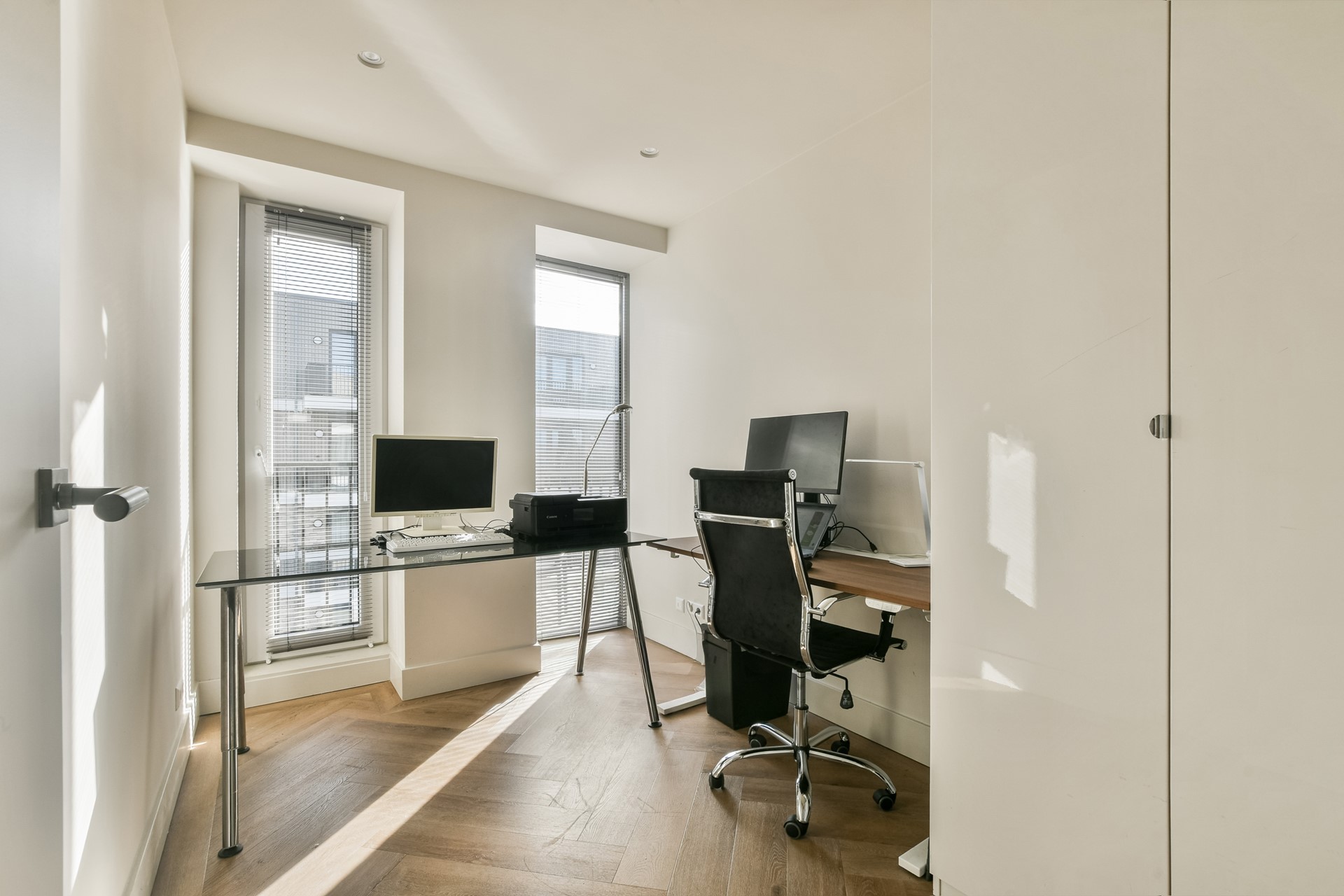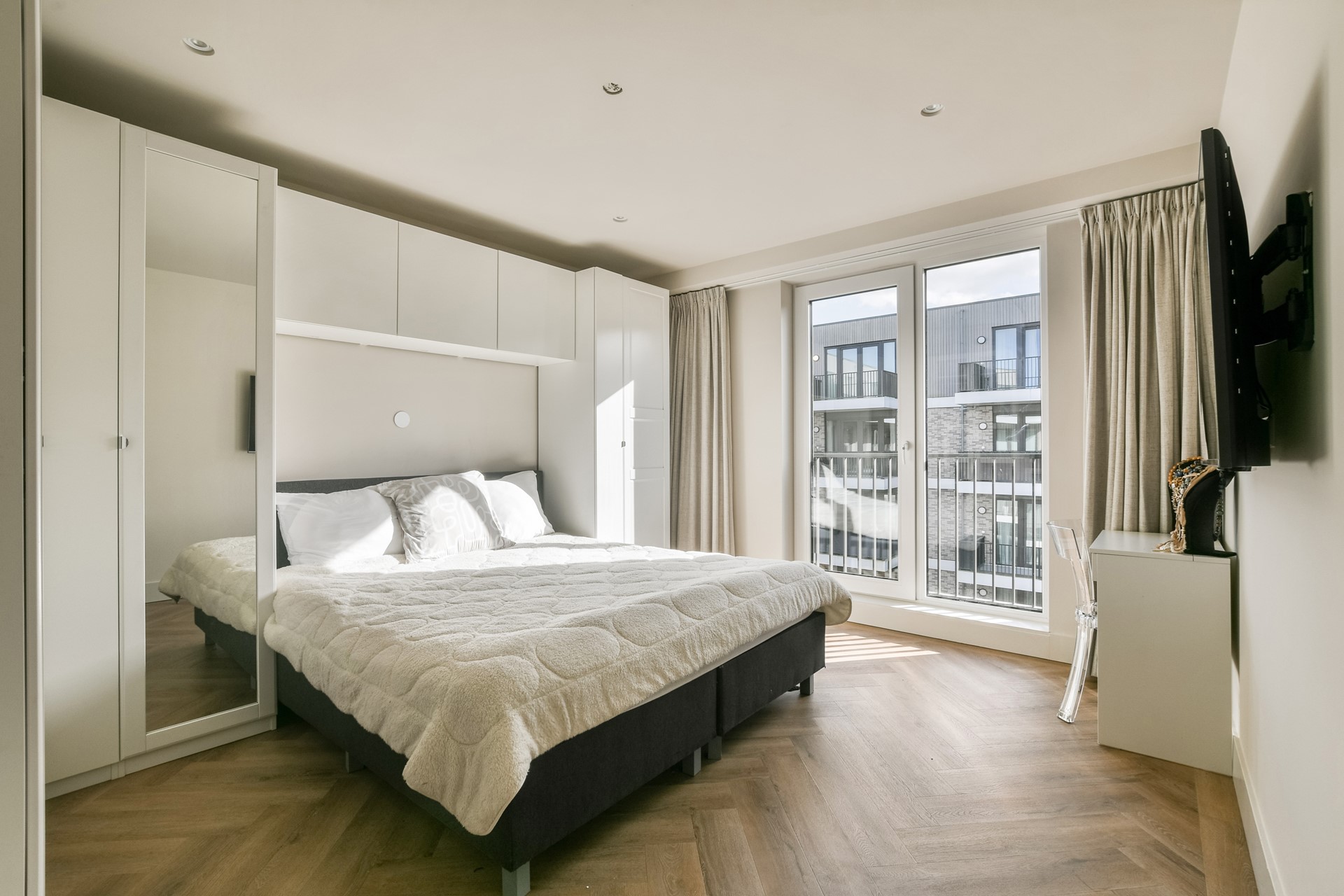 The entire apartment features a high-quality PVC floor in a herringbone pattern, underfloor heating and cooling (individually adjustable per room), built-in wardrobes, and an alarm system.