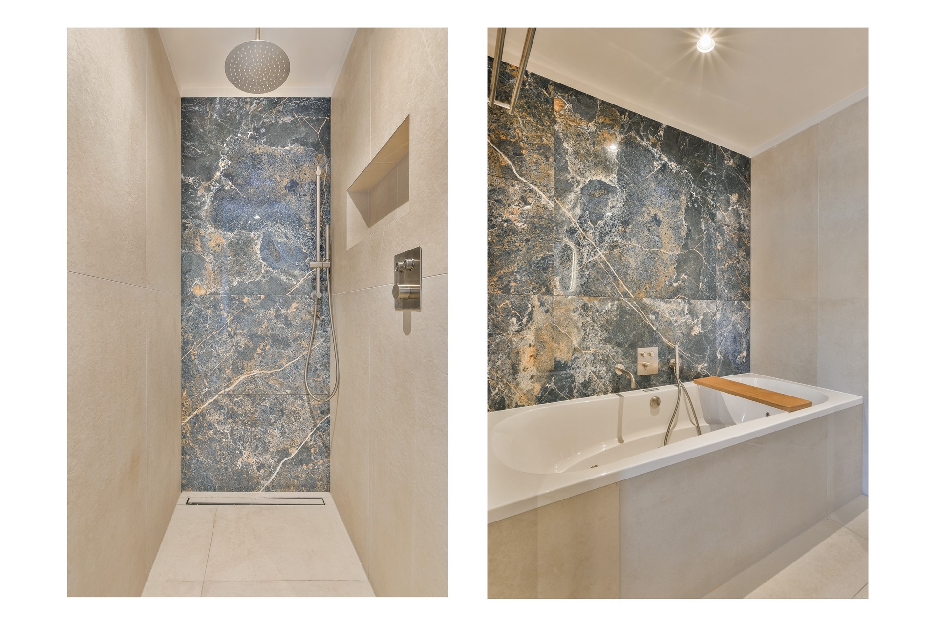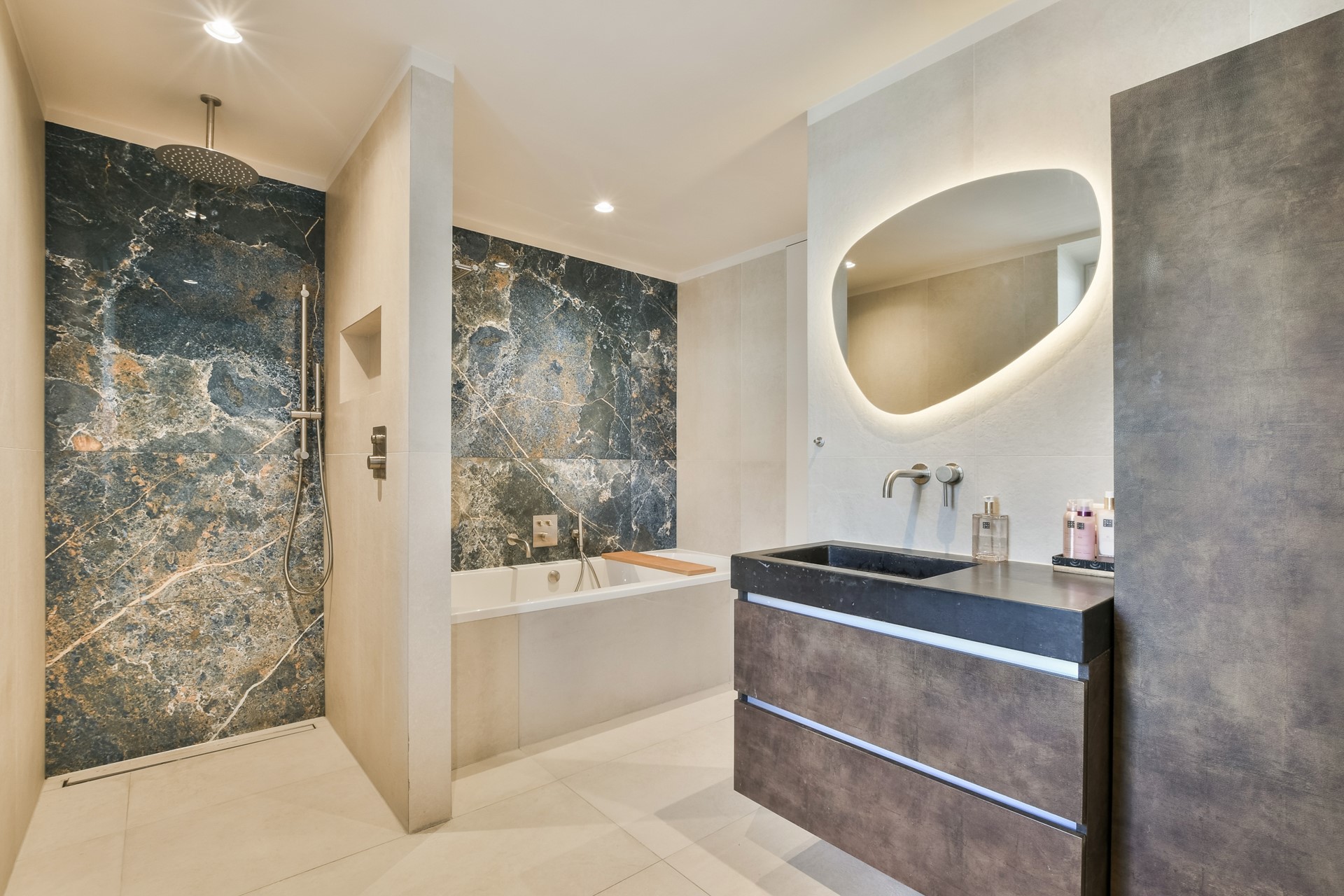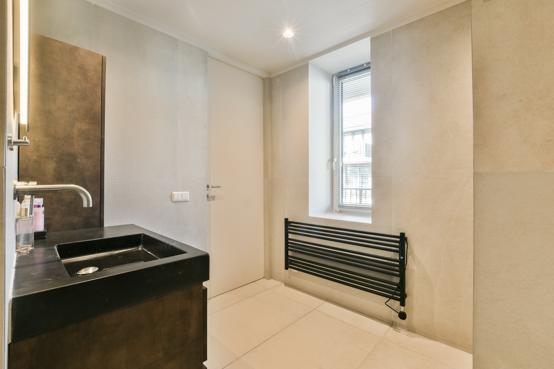 The generous bathroom is luxuriously finished and equipped with a bathtub/whirlpool, spacious walk-in shower, washbasin unit, and a second toilet. Here too, the high-quality finish and custom work are immediately noticeable.
